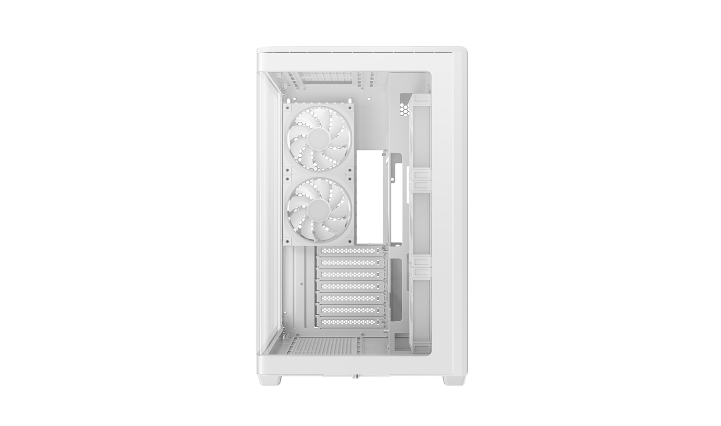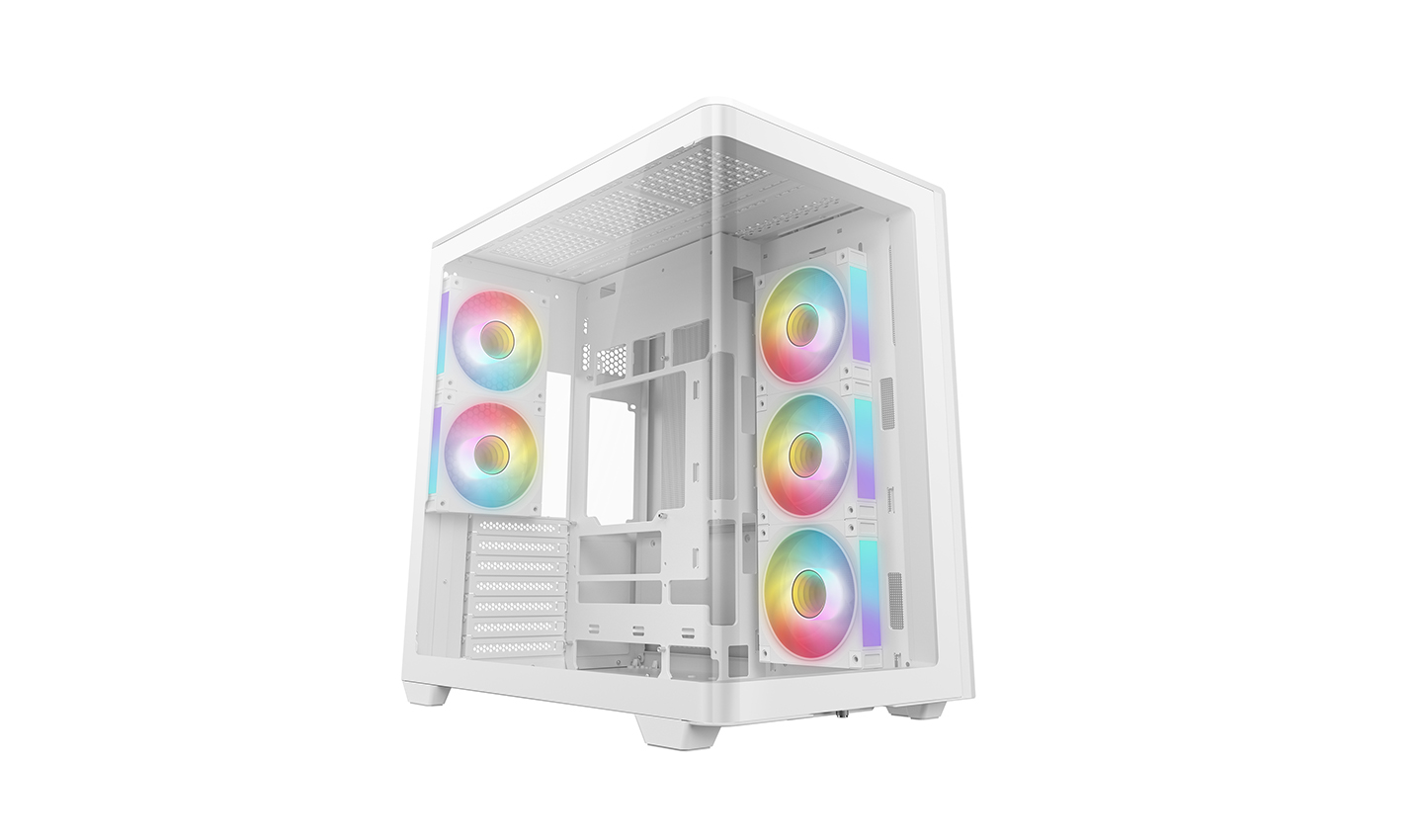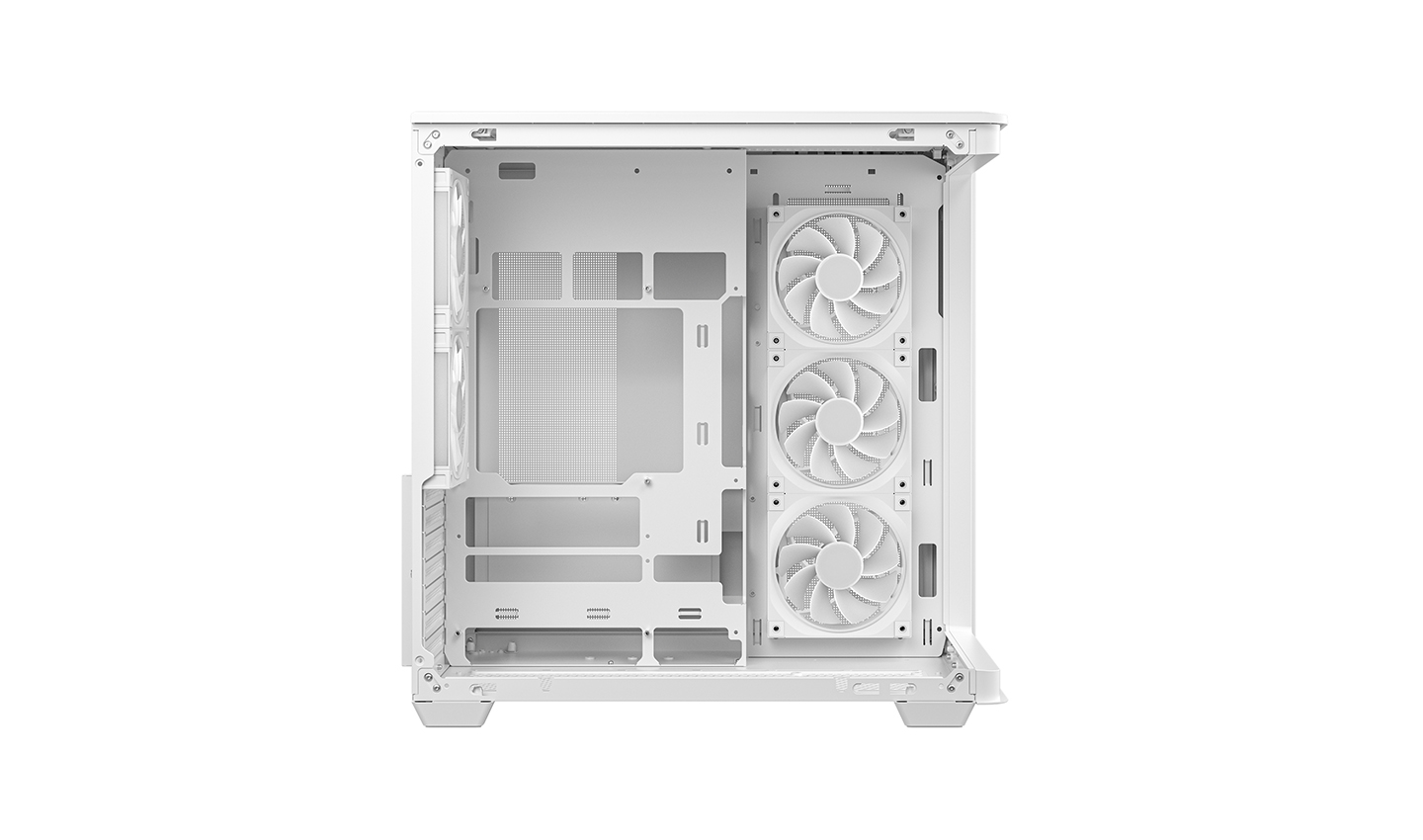 O CG590U 5F WH é um gabinete panorâmico de vidro curvo com design de câmara dupla. Equipado com cinco ventoinhas ARGB pré-instaladas, ele vem pronto para uso, oferecendo fluxo de ar potente e iluminação vibrante.