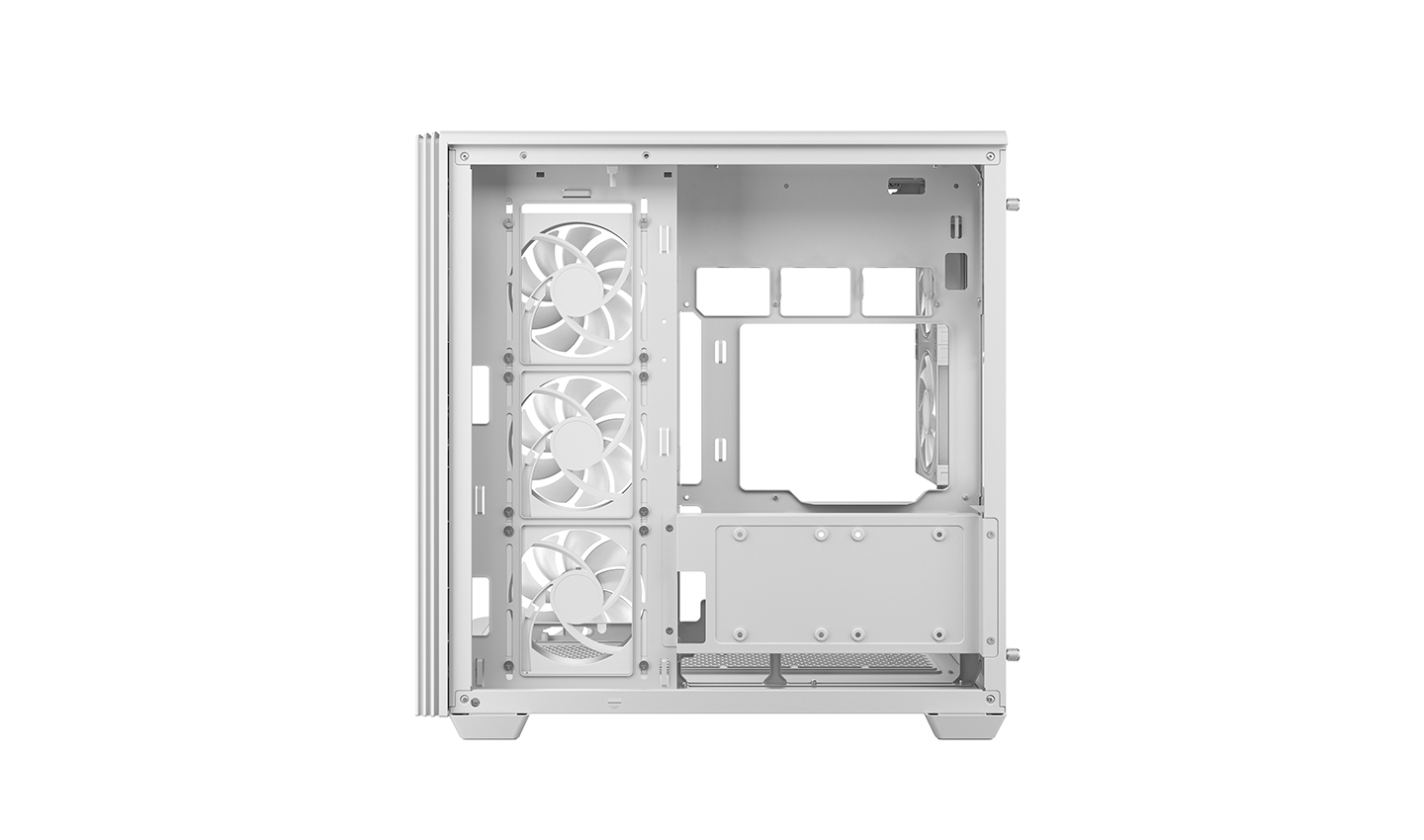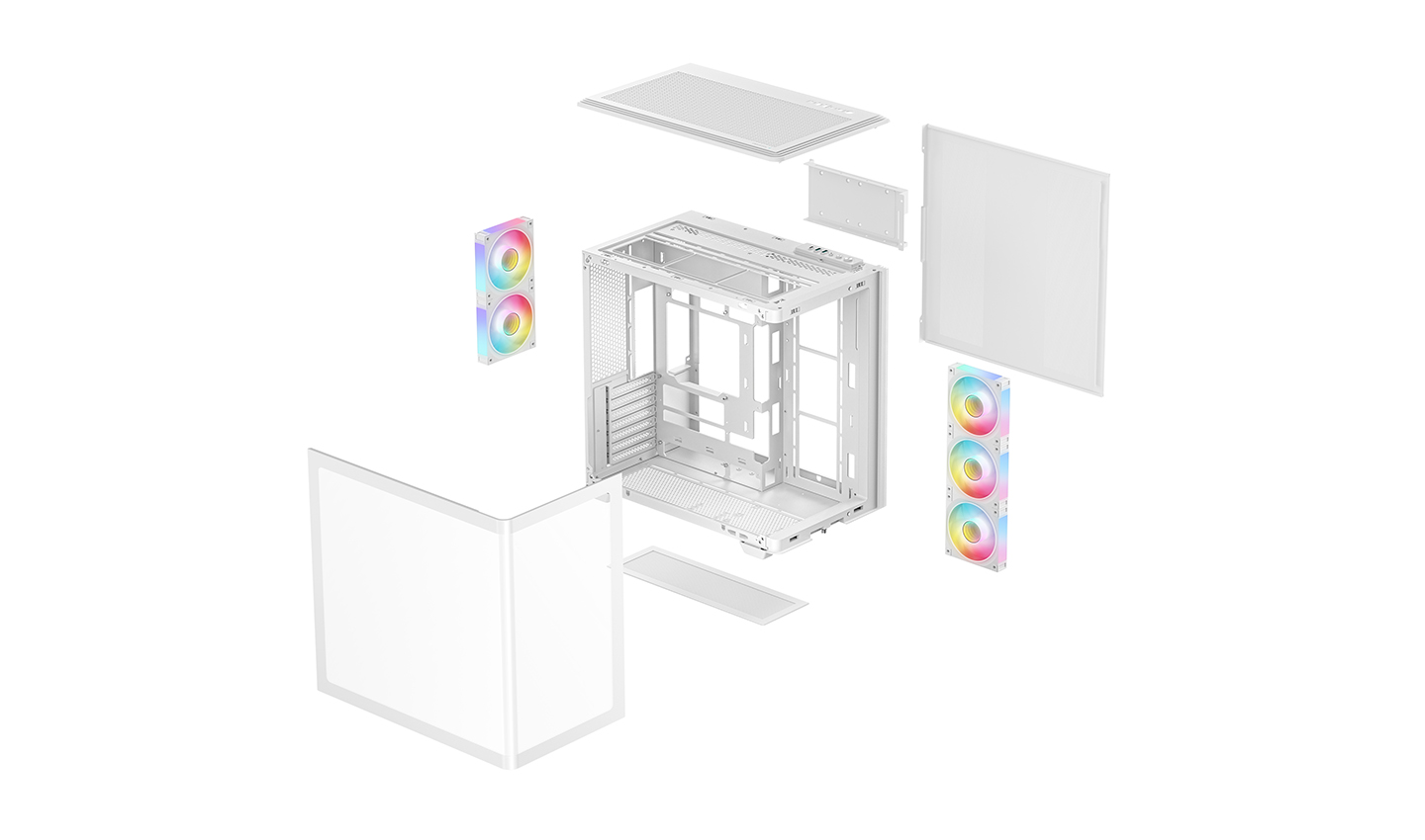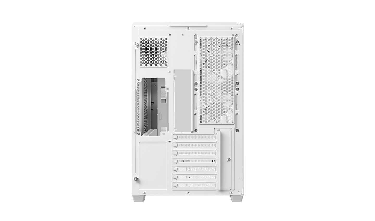 O CG590U 5F WH é um gabinete panorâmico de vidro curvo com design de câmara dupla. Equipado com cinco ventoinhas ARGB pré-instaladas, ele vem pronto para uso, oferecendo fluxo de ar potente e iluminação vibrante.