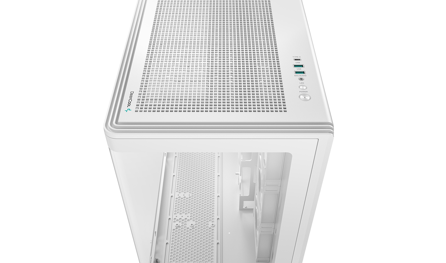 O layout de câmara dupla separa a fonte de alimentação e os drives em suas próprias zonas de resfriamento, mantendo livre o caminho de entrada de ar da GPU. Amplos painéis de malha na parte superior e lateral aumentam a ventilação em todo o gabinete.
