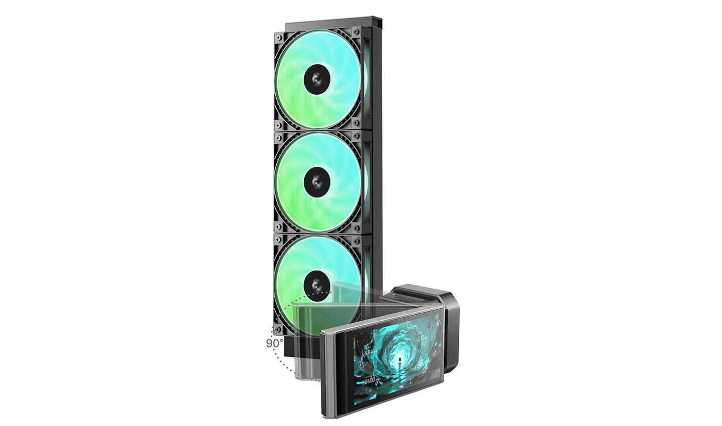 A exibição ajustável garante visibilidade limpa mesmo quando o refrigerador não estiver voltado para frente. Montado em uma articulação úmida, a tela pode ser virada em até 90°, o que permite que a exibição seja posicionada para uma visualização otimizada mesmo quando o estojo é posicionado em um ângulo lateral ou visto de lado.